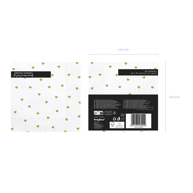 Χαρτοπετσέτες λευκές με χρυσές καρδούλες 33cm 20τεμ PartyDeco
